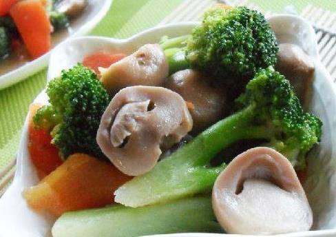 6.加入西蘭花塊,放鹽、雞粉、白糖、料酒,大火翻炒均勻,用水淀粉勾欠翻炒,出鍋裝盤。
