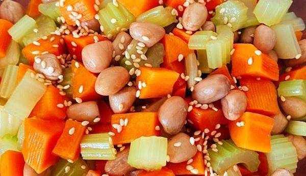 將花生米、芹菜、胡蘿卜倒入碗中,加入一勺芝麻油,一勺生抽,一勺陳醋,配比好的鹽糖,拌勻即可。
