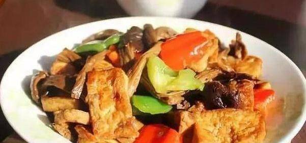 用料: 脆皮豆腐一斤、青椒少許、紅椒少許、薑少許、蒜少許、鹽適量、老抽少許、白糖少許、胡椒粉少許;