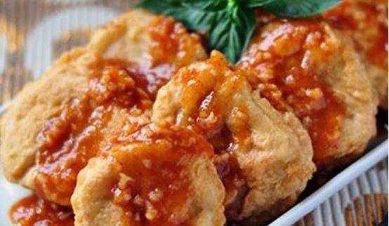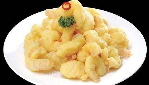 4.熱鍋下油燒至五六成熱時,將蝦仁放入攪拌均勻的糊中裹勻然後放入鍋中炸至金黃,撈出瀝油