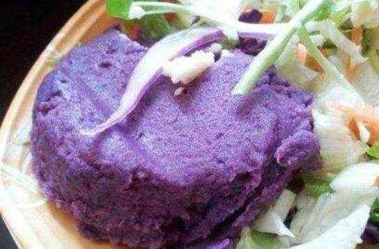3.紫薯,土豆碾碎放在一起,加白砂糖攪拌