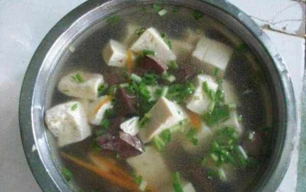 5,豬血豆腐湯,材料:豬血,水豆腐,生薑,雞精,鹽,油,小蔥。做法:豬血切成小塊,豆腐切成小塊,生薑切薑絲,小蔥切蔥花,出鍋放入水,加入豆腐,豬血,薑絲大火燒開,小火煮至10分鐘左右,調味放雞精,鹽,油,攪拌均勻,出鍋時放一點蔥花就可以瞭。