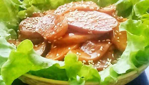 最後在盤子底部擺上生菜片,將醬好的杏鮑菇裝盤,上面撒少許白芝麻點綴即可。