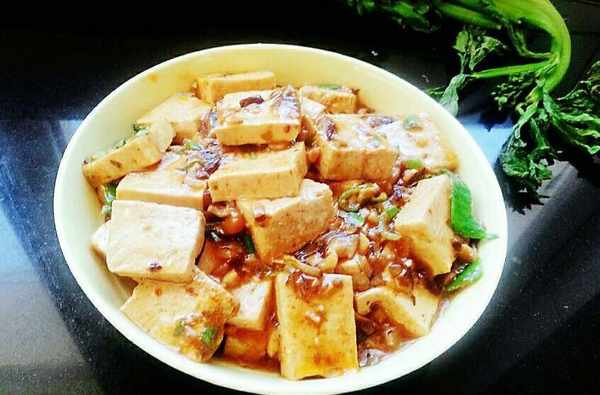 熱鍋倒油,油溫六成熱時加入鹽,加入切好的香菇粒,翻炒至香菇出水以後,加入適量生抽,老抽,五香粉,一勺耗油,半勺炸好的辣椒油,辣椒的量可以根據個人喜好添加,略炒以後加入適量清水,水開以後下入豆腐塊,蓋上蓋子略煮至豆腐入味,大約3分鐘以後,加入一點雞精,適量的水淀粉,炒至粘稠以後撒上蔥花兒,醬香豆腐就做好瞭。