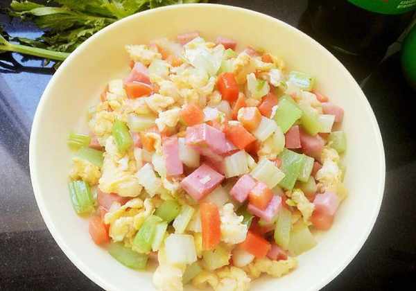 準備西芹兩顆,胡蘿卜半截,火腿一塊,雞蛋兩個;