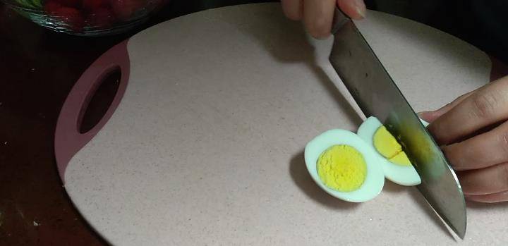 4、雞蛋煮熟後切開,一個雞蛋開四瓣