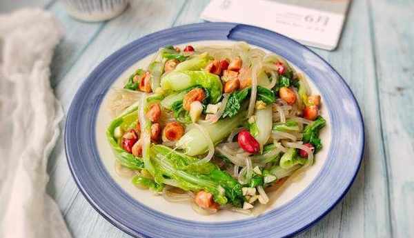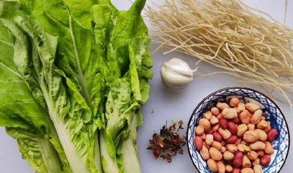 【食材】小白菜,紅薯粉條,花生米,蒜,食鹽、生抽、香醋、白糖、芝麻香油適量。