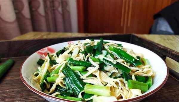 【做法】1、蒜苗摘洗幹凈,千張焯水後切成絲,蒜薑切末。2、炒鍋放少許植物油,先炒香蒜薑,接著倒入千張,加入小半碗清水。3、調入食鹽、生抽翻炒均勻,蓋上蓋子燜2分鐘。4、待水分基本收幹,加入蒜苗,繼續炒片刻,加入少許雞精炒均,就可以出鍋瞭。