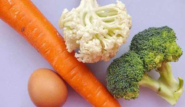 【食材】花椰菜,西蘭花,雞蛋,胡蘿卜,蒜,油、食鹽、十三香、味極鮮、雞精適量。
