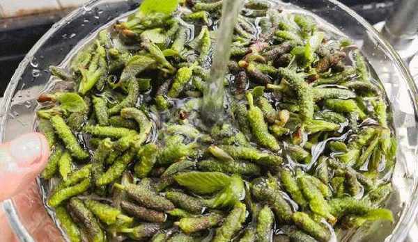 【食材】構樹穗,玉米面,蒜,食鹽、生抽、香醋、芝麻香油適量。