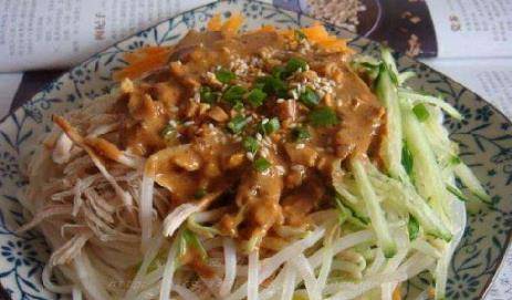 然後就是決定味道好壞的醬汁瞭,把芝麻醬、鹽、耗油、蔥花、蒜末、薑末、醋和香油加一點涼白開拌在一起,用量根據自己喜好放就可以,可以邊試邊調。再把黃瓜和胡蘿卜切絲,蔬菜用青紅椒絲等等都可以。然後把面瀝幹水份撈到盤裡,鋪上黃瓜絲和胡蘿卜絲,再把醬汁一淋酒大功告成瞭。涼面的做法還是非常簡單多變的,喜歡的朋友可以試一試。