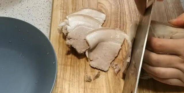 【步驟五】等到肉差不多涼瞭,再撈出來,讓肉塊把水晾幹,表面的水氣晾幹後,就將肉切成薄片,當然刀工好的可以切得再薄一點。肉切完後,就把切得不成形的放在盤子最底下。