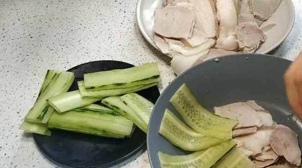 【步驟六】如果光是肉的話,會有點油膩。一根黃瓜洗凈後切成長片,當黃瓜片放在不成形的肉片碎上。然後將好看又成型的肉就放在黃瓜片上,簡單的造型就做完瞭。當然按照個人的喜好,覺得直接吃也沒問題,可以不用準備黃瓜。