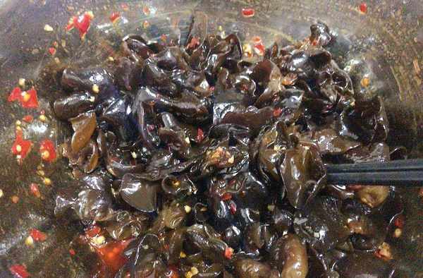 6:把瀝幹水分的黑木耳倒入盆裡,再把熬制好的辣椒醬也倒入盆裡,最後再加適量的生抽、鹽、糖和香醋,用筷子攪拌均勻即可裝盤瞭