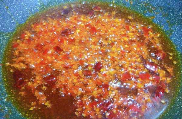 5:用小火把鍋裡的蒜泥和辣椒醬慢慢熬制成蒜蓉辣椒油,熬的時候要用鍋鏟不停的攪拌防止糊鍋糊底