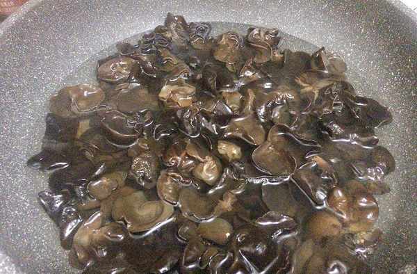 2:鍋裡倒入半鍋清水,大火燒開後倒入泡發好的黑木耳汆燙2分鐘左右