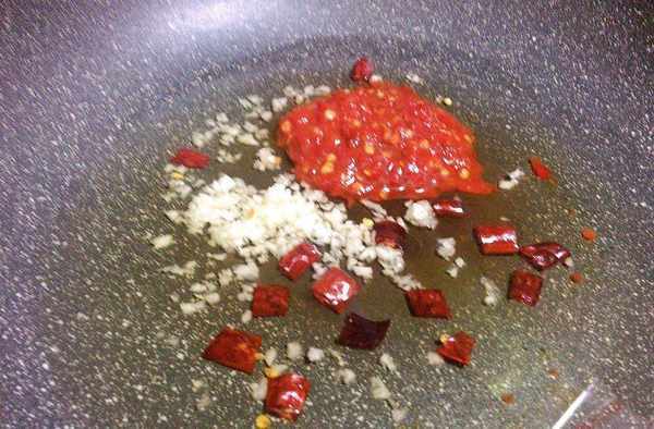 4:鍋裡倒入適量的食用油,再加入準備好的湖南辣椒醬、蒜泥和幹辣椒碎
