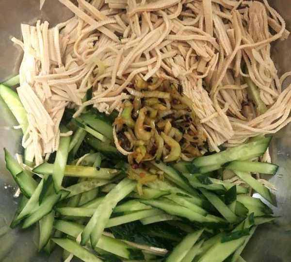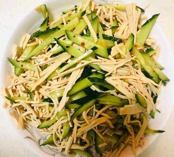 原料:黃瓜、幹豆腐絲、黑芝麻、鹽、辣子油、植物油、醬油、醋、香油、白砂糖、雞精、十三香。