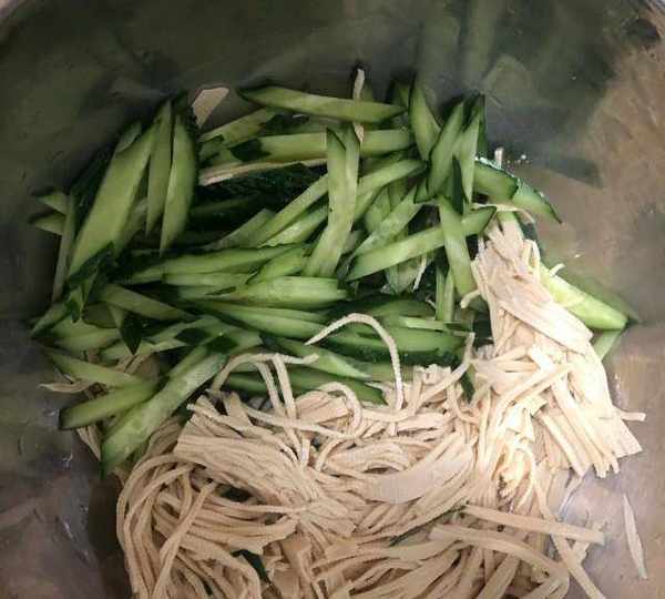 第2步、黃瓜切粗絲兒與豆腐絲兒放在一個大盆內。