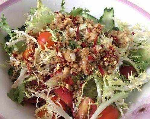 最後將調好的醬汁倒入裝有各色蔬菜的碗內,再加入適量香油,攪拌均勻後,靜置十分鐘就可以吃瞭!
