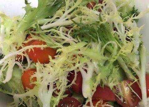 將燙好的圓包菜放入圓碗內,然後依次放入黃瓜片、紅黃色聖女果、苦菊;