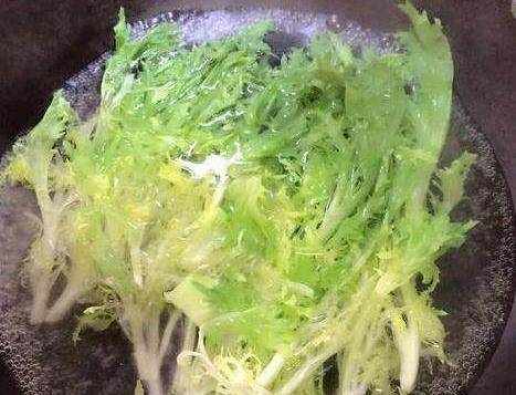 然後將苦菊也放入鍋內過水,這裡註意瞭,苦菊容易爛,所以隻要在開水鍋裡稍微擺動兩下就可以出鍋瞭,不然燙爛瞭就不好吃瞭;