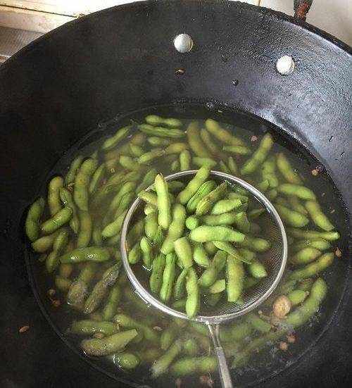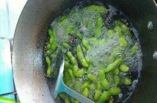 2、在鍋中倒入清水,將洗幹凈的毛豆放入鍋中,再放入八角、花椒、香葉、桂皮,再放入適量食鹽入味兒,大火煮3-5分鐘即可出鍋