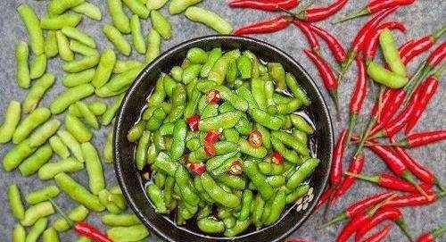 食材:新鮮帶殼毛豆、朝天椒(幹辣椒和新鮮辣椒都可)、八角、花椒、香葉、桂皮、大蒜、醋、食鹽、食用油、雞精、生抽