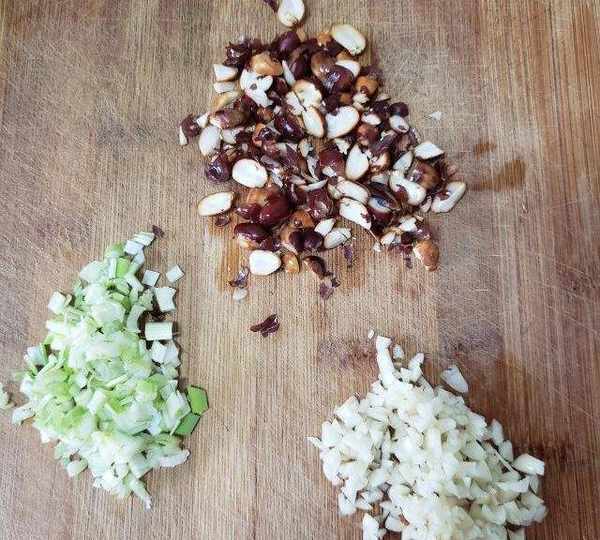 第5步、炸好的花生米、蔥和蒜切碎。
