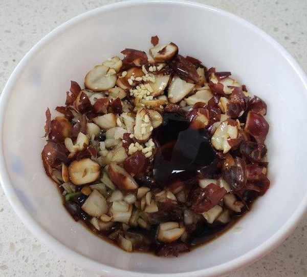 第6步、花生米、蔥和蒜加少許鹽、醋、生抽、蠔油和雞精,澆上熱油。