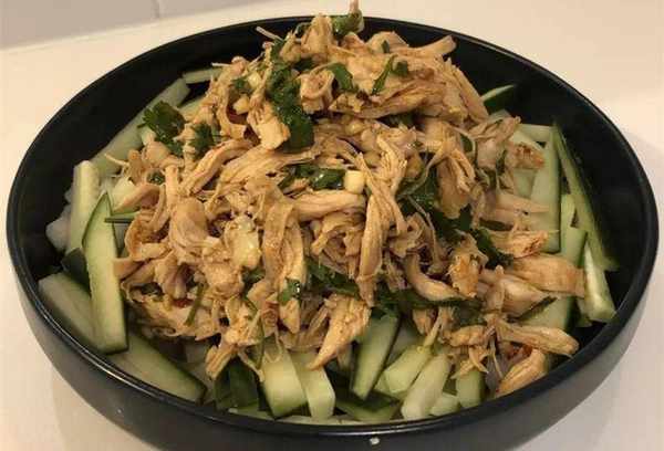 3.將雞肉、香菜、黃瓜絲、辣椒和醬汁拌勻,放入冰箱30分鐘後即可享用