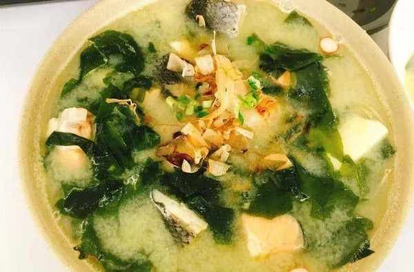 食材:三文魚丁1包、豆腐1塊、味増2湯匙、柴魚片2湯匙、幹燥海帶芽1包
