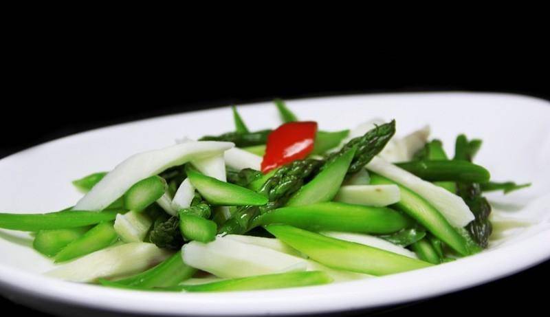 3.鍋內入油燒熱,放入山藥和蘆筍煸炒,加適量鹽調味翻炒均勻,放入紅椒,即可出鍋