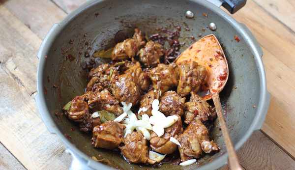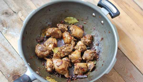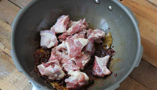 8.中小火煸炒鴨塊,逼出皮內油脂。