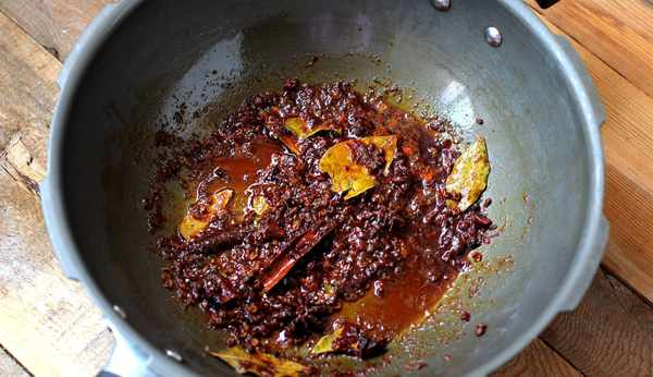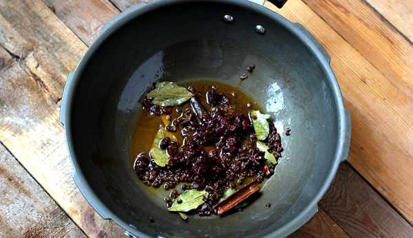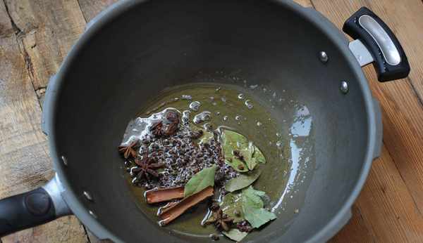 4.炒鍋加入食用油,放入花椒、八角、桂皮、丁香和香葉,小火炸出香味。