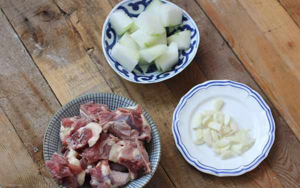 3.將鴨斬大塊,冬瓜去皮洗凈切大塊,大蒜去皮用刀拍扁備用。