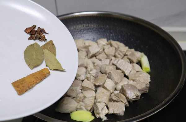 4、倒入八角、桂皮、香葉,繼續翻炒一會,炒出香料的香味。