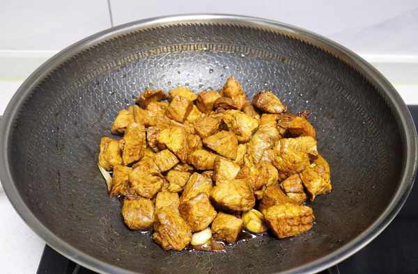 3、蔥薑蒜爆香後,倒入焯過水的豬肉塊,中小火翻炒一會。