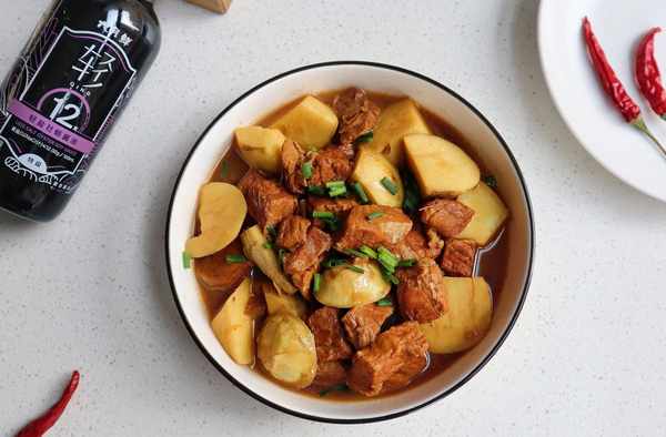 5、這時先沿鍋邊淋入適量的料酒,翻炒均勻後再淋入適量生抽和老抽,繼續翻炒,讓每一塊肉塊都均勻地裹上顏色。