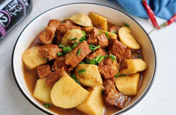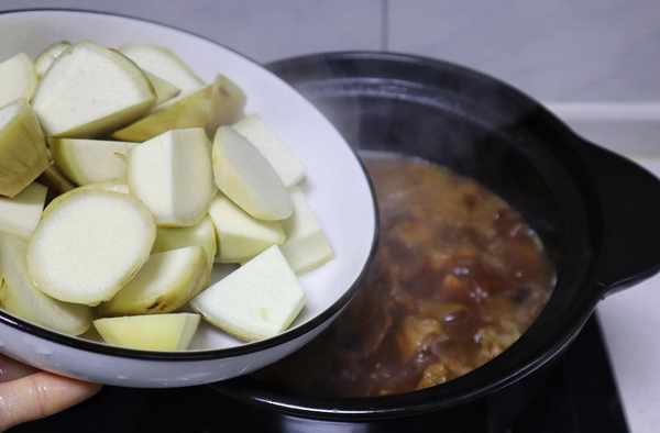 10、肉燉熟後,倒入切好的茨菇塊,再加入適量的食鹽和1小勺白糖,蓋上蓋再煮10分鐘。