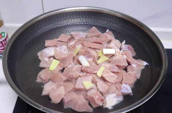 1、豬肉洗凈後切成2厘米左右的方塊,涼水下鍋,放入蔥段、薑片,淋入適量的料酒,大火燒開,撇去浮沫,撈入溫水中清洗幹凈。