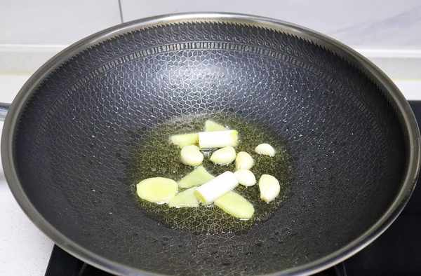 2、炒鍋加熱,倒入適量的植物油,油熱後下入蔥段、薑片、蒜粒爆出香味。