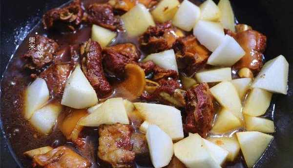7,待排骨燉熟瞭,將白蘿卜倒進來,再燉十分鐘左右。