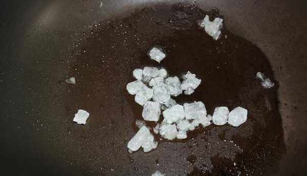 2,炒鍋燒熱,倒入少許食用油,再放入一小把冰糖。中火將冰糖炒至融化,再改小火不停地炒。