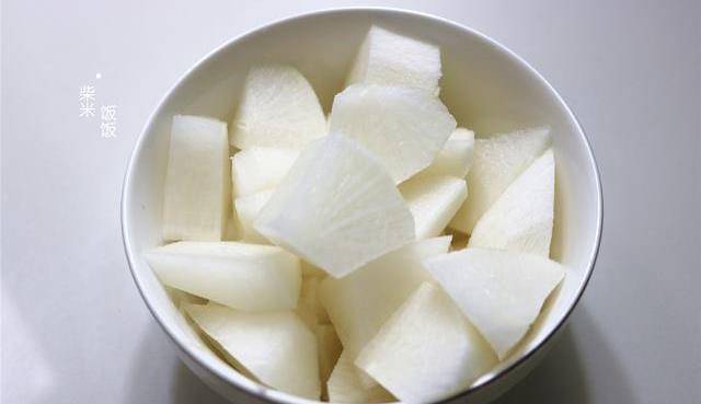 6,趁著燉排骨的時間,將白蘿卜去皮洗凈,切成滾刀塊。