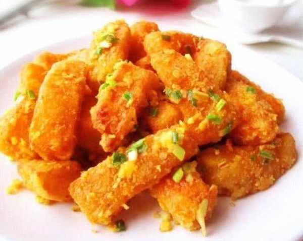 1,蛋黃南瓜。材料:咸鴨蛋,南瓜,鹽,油。做法:南瓜去皮切1厘米長的四方條,然後撒入鹽拌勻,殺出南瓜的水分,再把南瓜條裹上一層薄薄的生粉,鍋放油燒熱小火將南瓜條炸至金黃色撈出,再開大火把南瓜再復炸,這樣使南瓜條更酥脆。咸鴨蛋放到鍋裡煮熟,再取出蛋黃壓碎,鍋裡加一點油,加入蛋黃碾碎翻炒至起泡時,放入南瓜條快速翻炒均勻的裹上蛋黃即可出鍋。