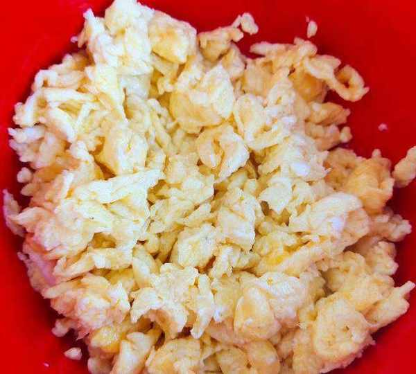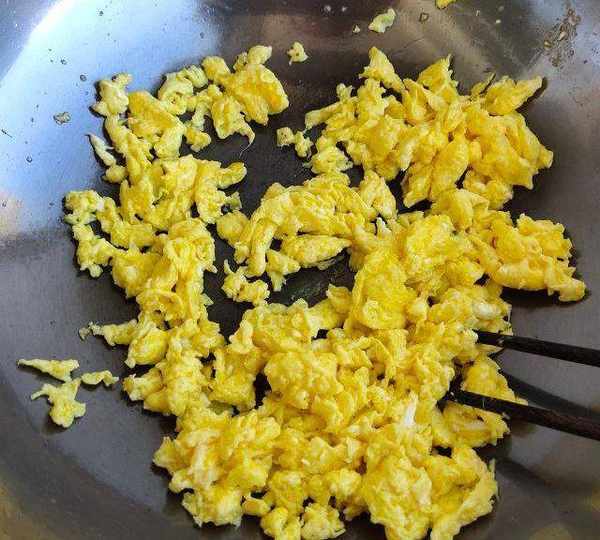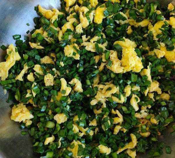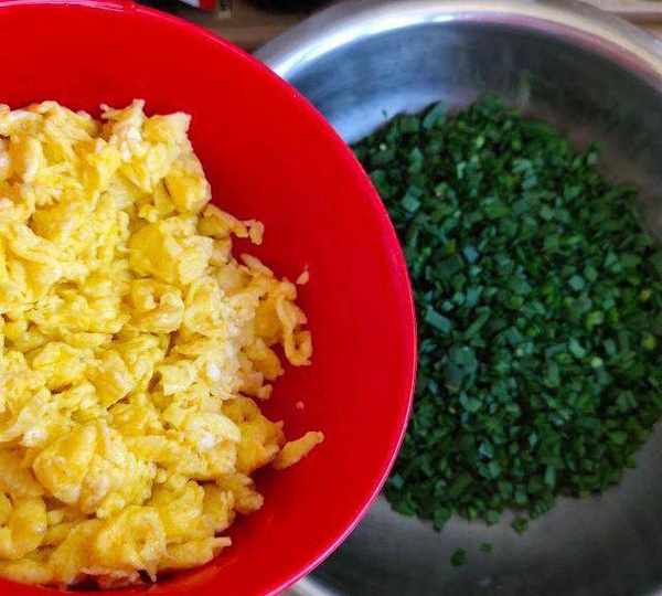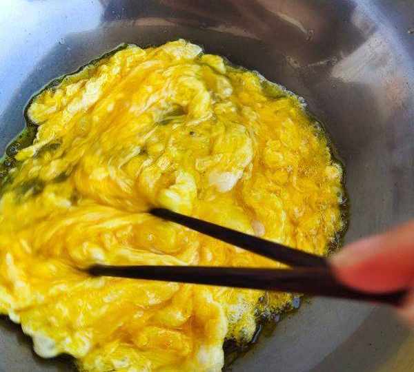 第14步、將雞蛋碎加入韭菜中。