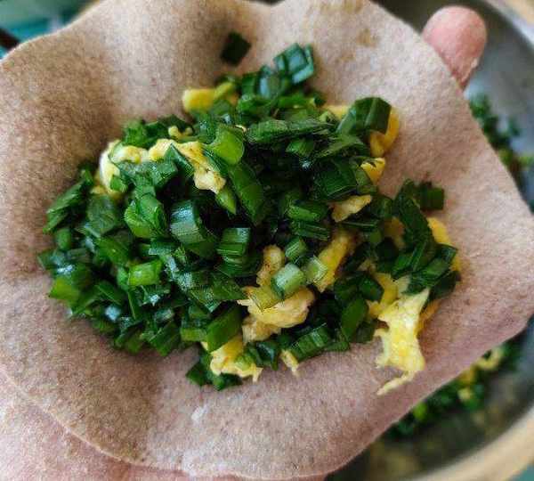 原料:黑全麥粉、韭菜、雞蛋、香油、食用油、黑胡椒粉、鹽、蠔油。