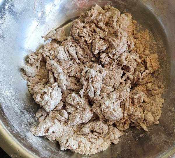 第3步、少量多次倒入面粉中,筷子充分攪拌,攪成面絮。