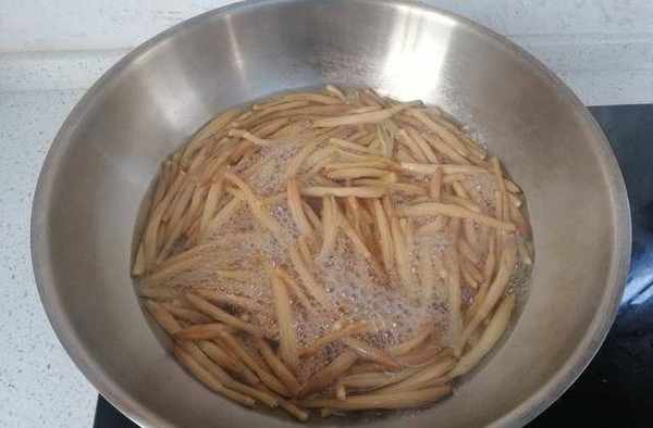 2.淖水,炒鍋內加水燒沸騰,黃花菜倒入進去用勺子攪動受熱均勻,大概在3分鐘左右後黃花菜就斷生熟透瞭,即可撈起備用。
